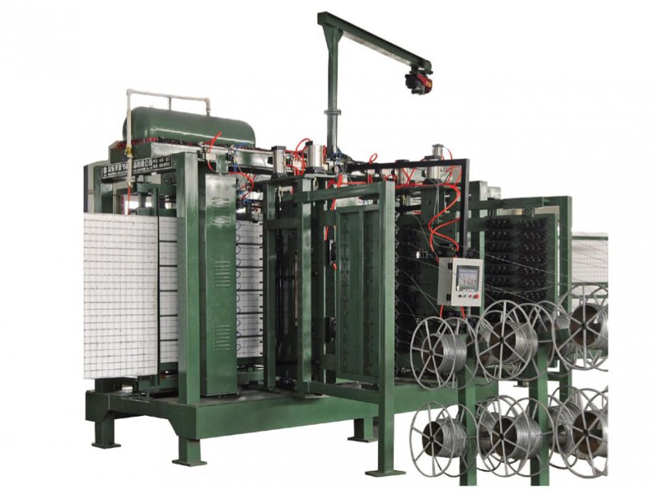 連續式送絲插絲機主要有3DW-1200型鋼網焊接機組和CH-V-1200型成型焊接機組作為連續式送絲的主機,CH-V型成型機采用PLC觸摸屏控制,具有自動化程度高,生產的S類夾芯板的產量及質量都優于國內同類產品,尤其在漏焊率方面低于2%,少了補焊環節。該機組為立式焊接形式,與臥式焊接機組相比具有操作、維修方便,產品外觀平整等顯著特點。